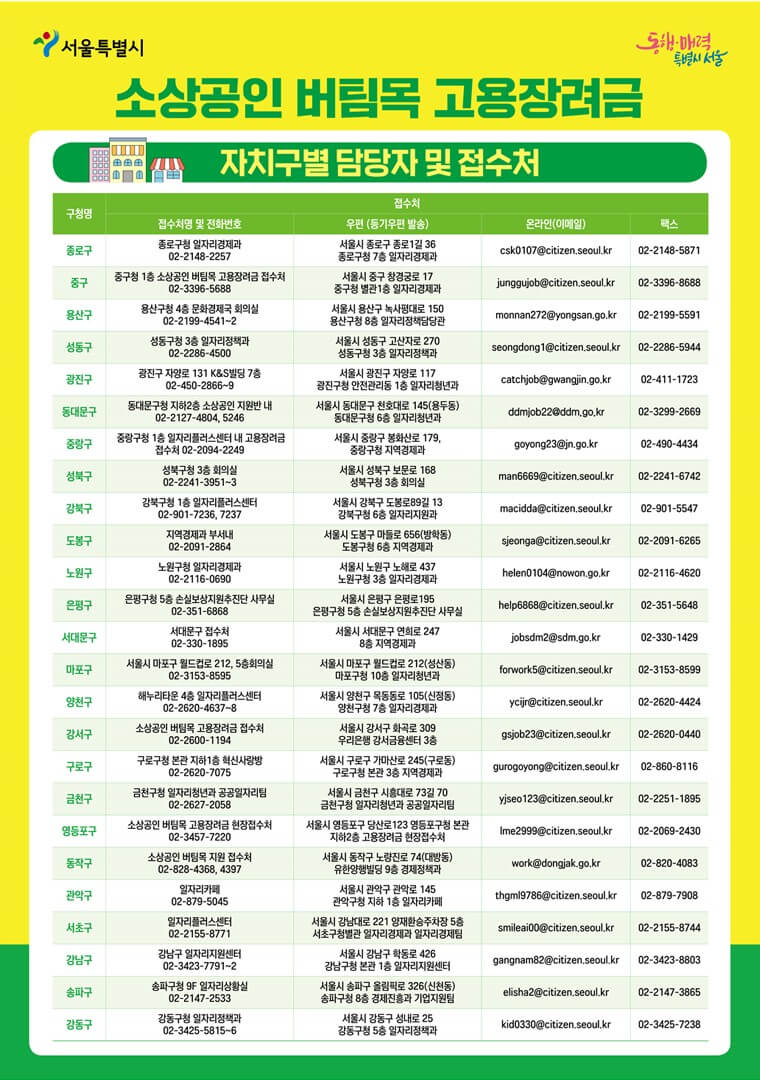 기업체 소재 자치구별 접수처와 담당자가 상이합니다. 신청 서류 작성 후 해당 자치구 접수처에 접수하시면 됩니다. 아래 자치구별 담당자와 해당 접수처를 정리해 놓았으니 해당 자치구를 클릭하셔서 미리 확인 하시기 바랍니다.