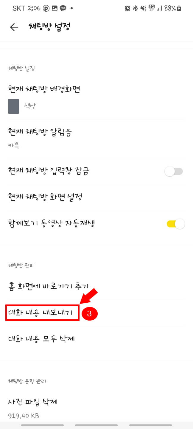 ▶ ③ 「대화 내용 내보내기」을 눌러줍니다.