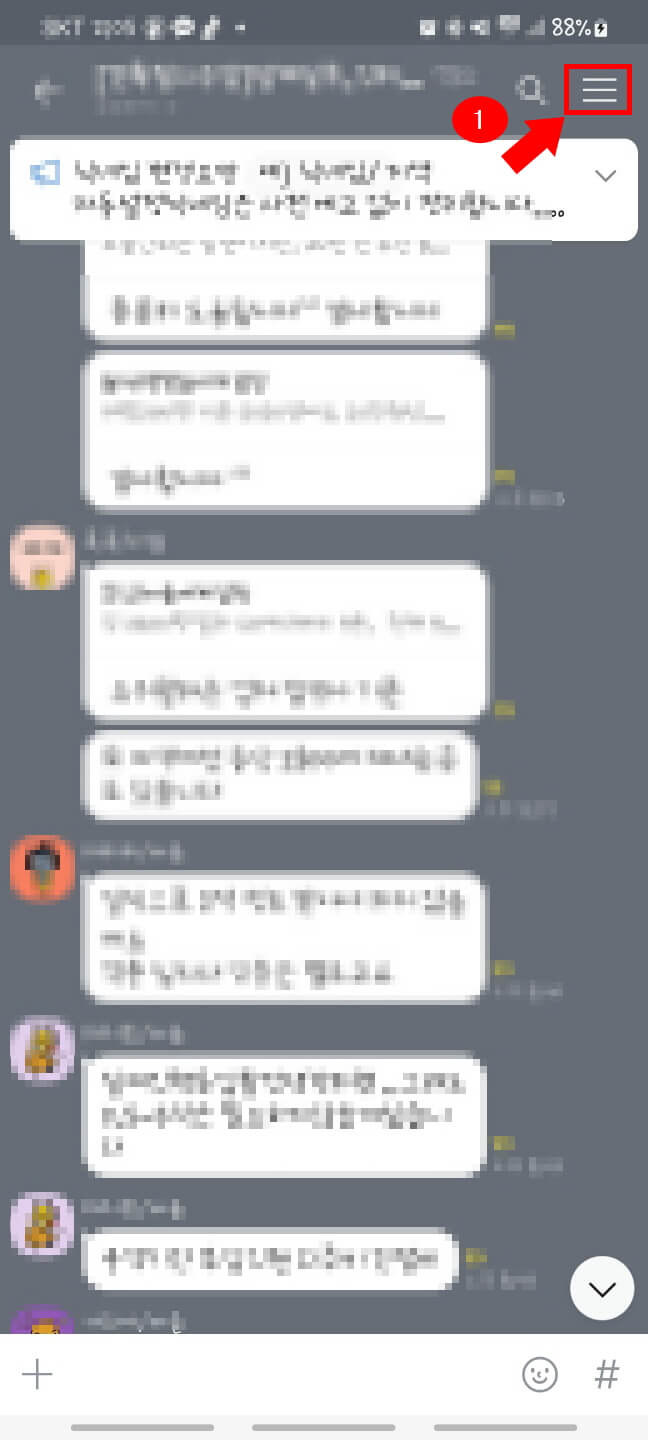 ▶ ① 해당 오픈 채팅방의 우측 상단의 「삼선」 표시를 눌러줍니다.