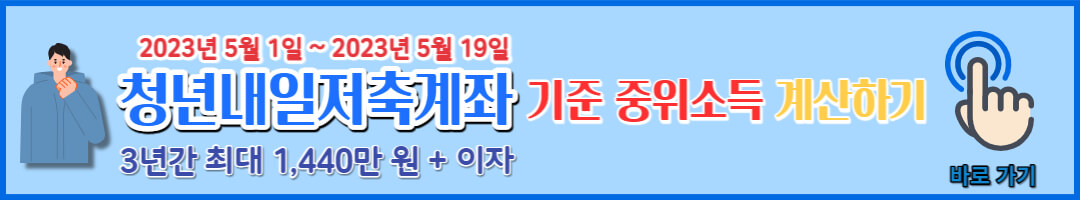 중앙부처복지 사업의 일환으로 일하는 기준중위계층 청년들의 자산형성지원을 통해 사회에 안정적으로 안착할 수 있게 도움을 주는 사업으로 2023년 「청년내일저축계좌」2023년 5월 1일부터 신청을 받습니다.